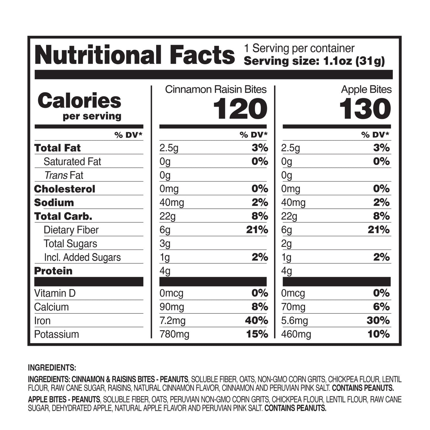 The ultimate way to snack smarter and feel fuller, longer. Each 1.1 oz bag contains bite-sized granola cubes packed with whole grains, plant-based protein, and naturally sweet ingredients like cinnamon, raisins and apple.