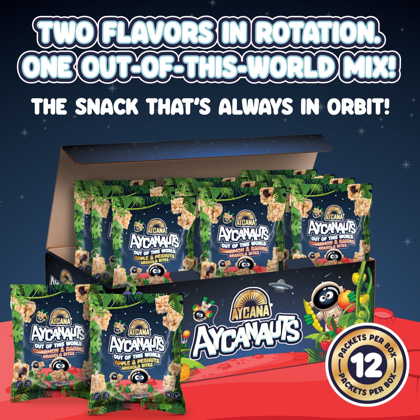 AYCANAUTS Orbits BITES Mix is a dynamic duo of nutritious, space-themed granola snacks that deliver clean, delicious energy for kids on the go. With Cinnamon & Raisins and Apple & Peanuts BITES in every box, this pack is perfect for school snacks, after-play fuel, or interplanetary lunchbox missions.