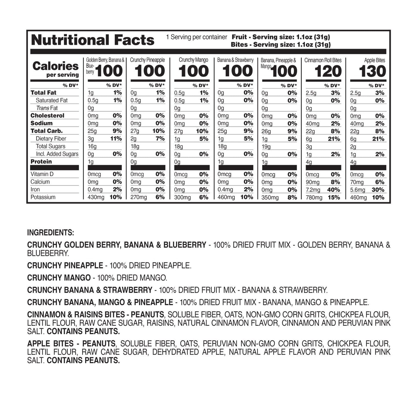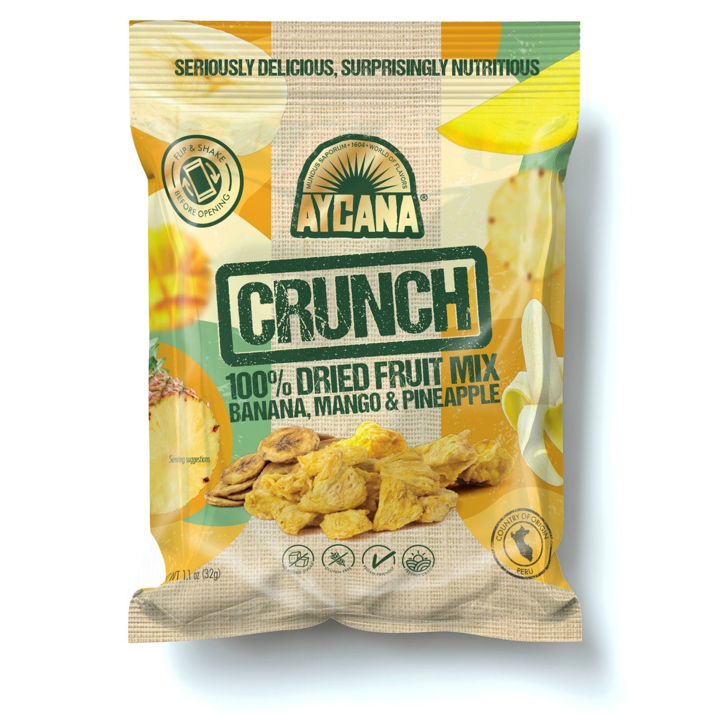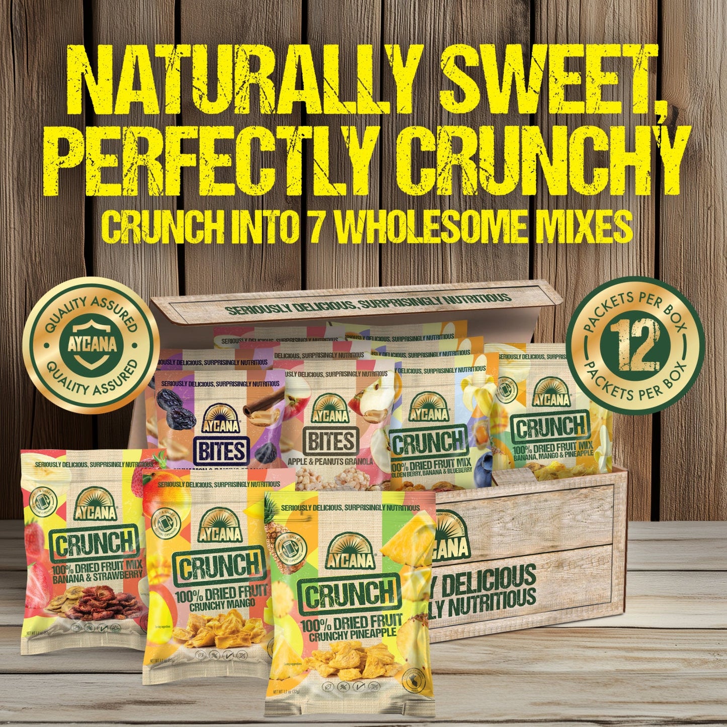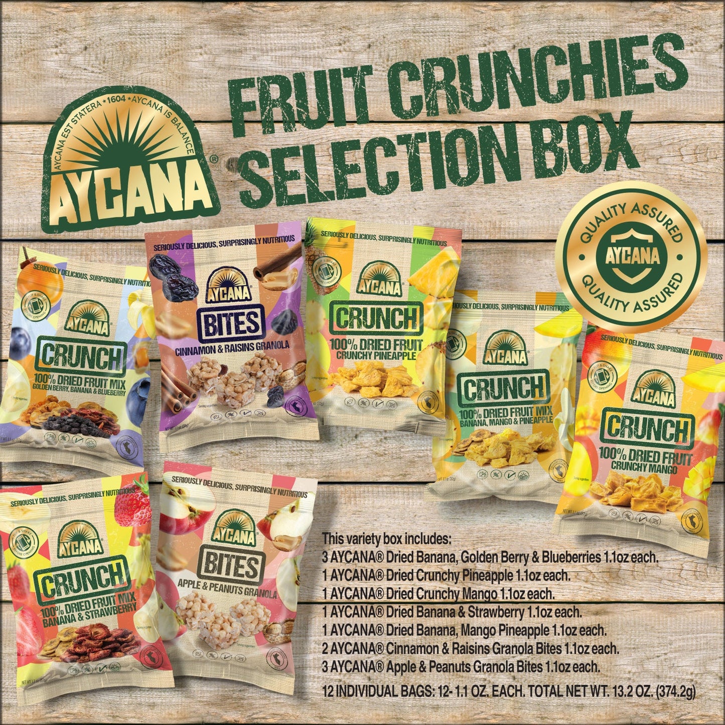 The Aycana Fruit Crunchies Variety Pack is a 12-pack celebration of everything fresh, fruity, and delicious. Featuring our boldest CRUNCH fruit snacks and best-loved granola BITES, this box is packed with natural fiber, plant-based protein, and bright, tropical flavor in every single bag.