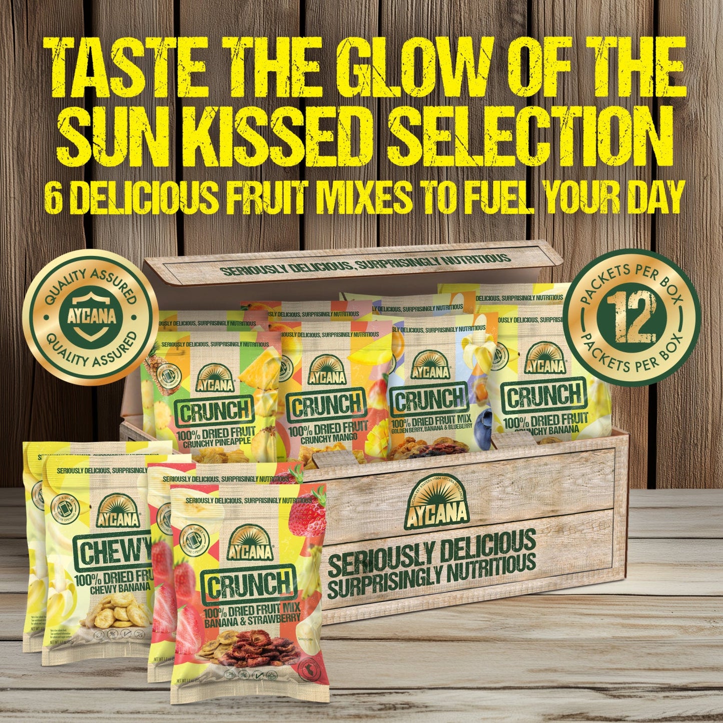 With every bite of chewy banana or crisp golden berry, the Sun-Kissed Box brings the taste of sunshine and clean nutrition into your day—no peeling required.