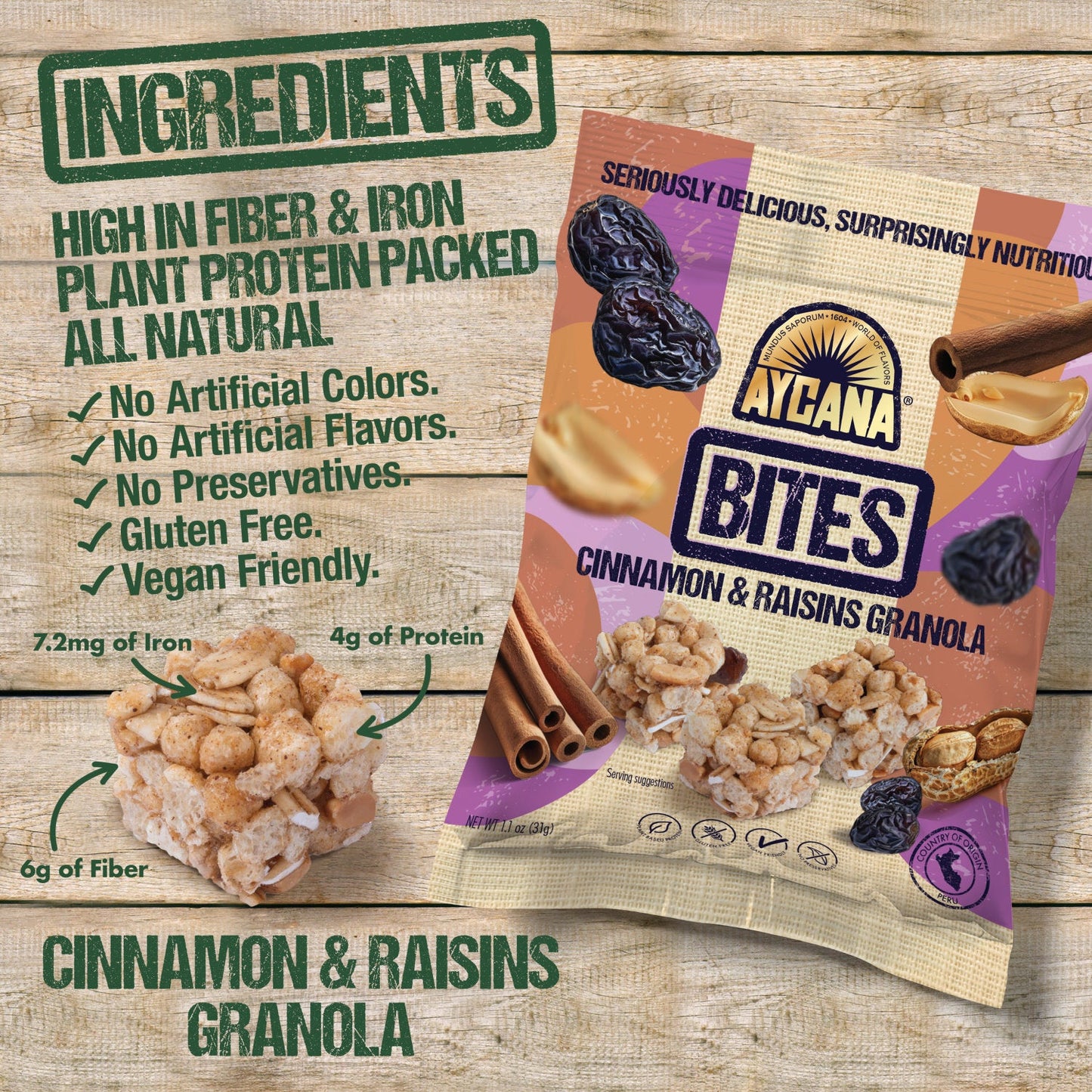 Aycana Snack & Go offers the ultimate way to snack smarter and feel fuller, longer. Each 1.1 oz bag contains bite-sized granola cubes packed with whole grains, plant-based protein, and naturally sweet ingredients like cinnamon, raisins and apple.